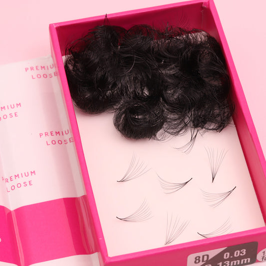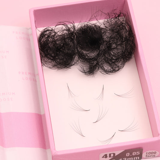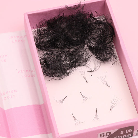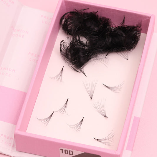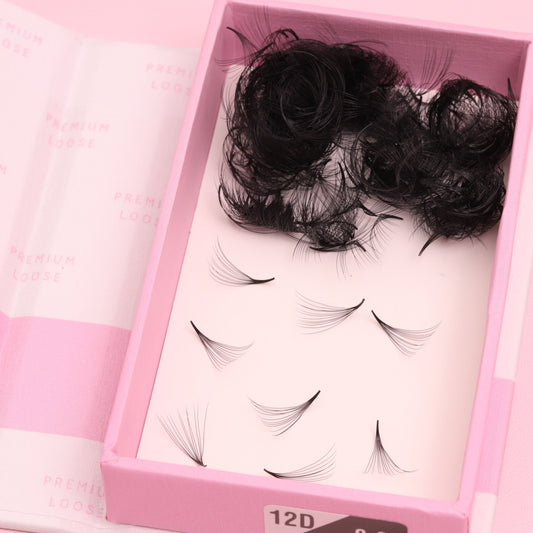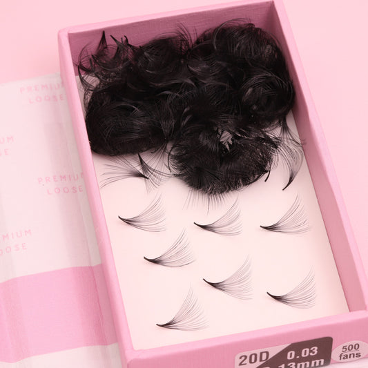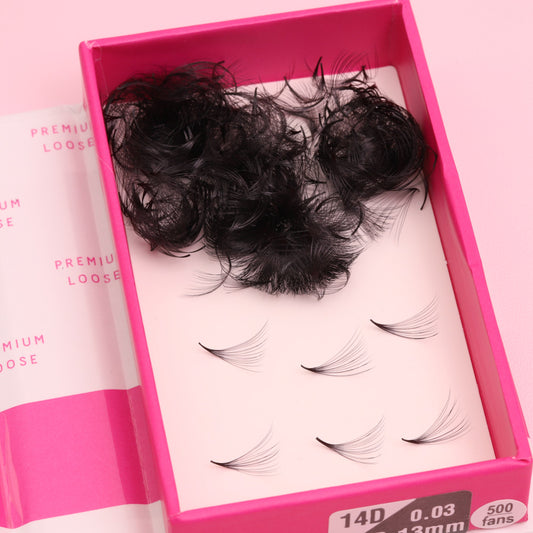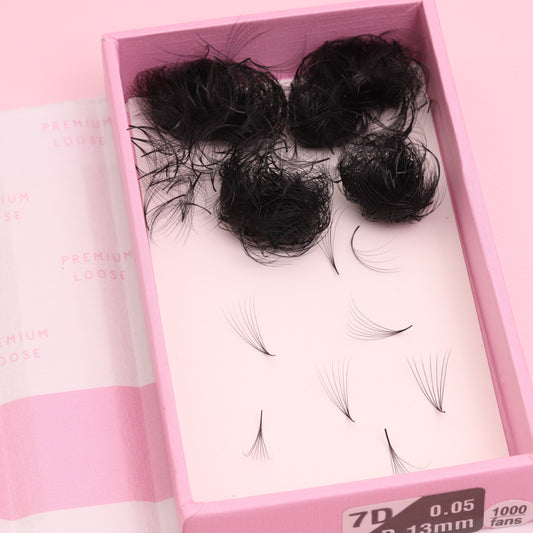 Promade loose fans are separated lash fans that are packed in a box. They are packaged in boxes of 1 size or mixed sizes. Depending on the type, they can also be separated so you can choose the number of lashes you can use each time.